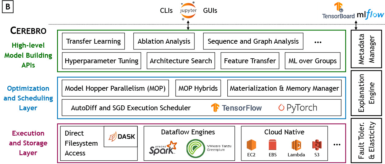 Cerebro will be the first DL platform to offer unified execution support with holistic resource optimization for all axes of scalability: model size, dataset size, example size, number of tasks, and for transfer learning. Its carefully layered architecture decouples the specification of model building tasks (e.g., in Keras APIs or AutoML heuristics) from the execution backend, making it portable across multiple backends: Kubernetes, Spark, Dask, Greenplum, Ray and soon, cloud-native IaaS.